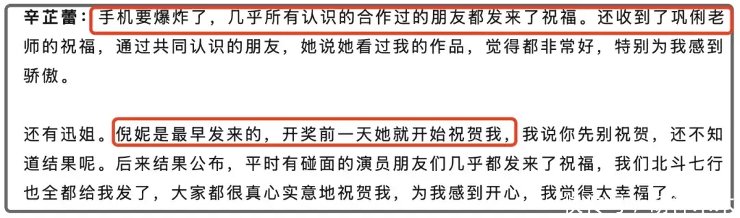 除了好友名导给自己送祝福,还让辛芷蕾感动的是同一时代的女演员们也都给自己发来了信息,赵丽颖说自己真心为辛芷蕾感到高兴,倪妮说自己羡慕嫉妒但是不恨,她为辛芷蕾感到骄傲。除了这两位,其实还有很多很多的祝福,让辛芷蕾很是感动。尤其辛芷蕾还强调,其实女演员之间的氛围都很好,没有大家想的那么乱七八糟。