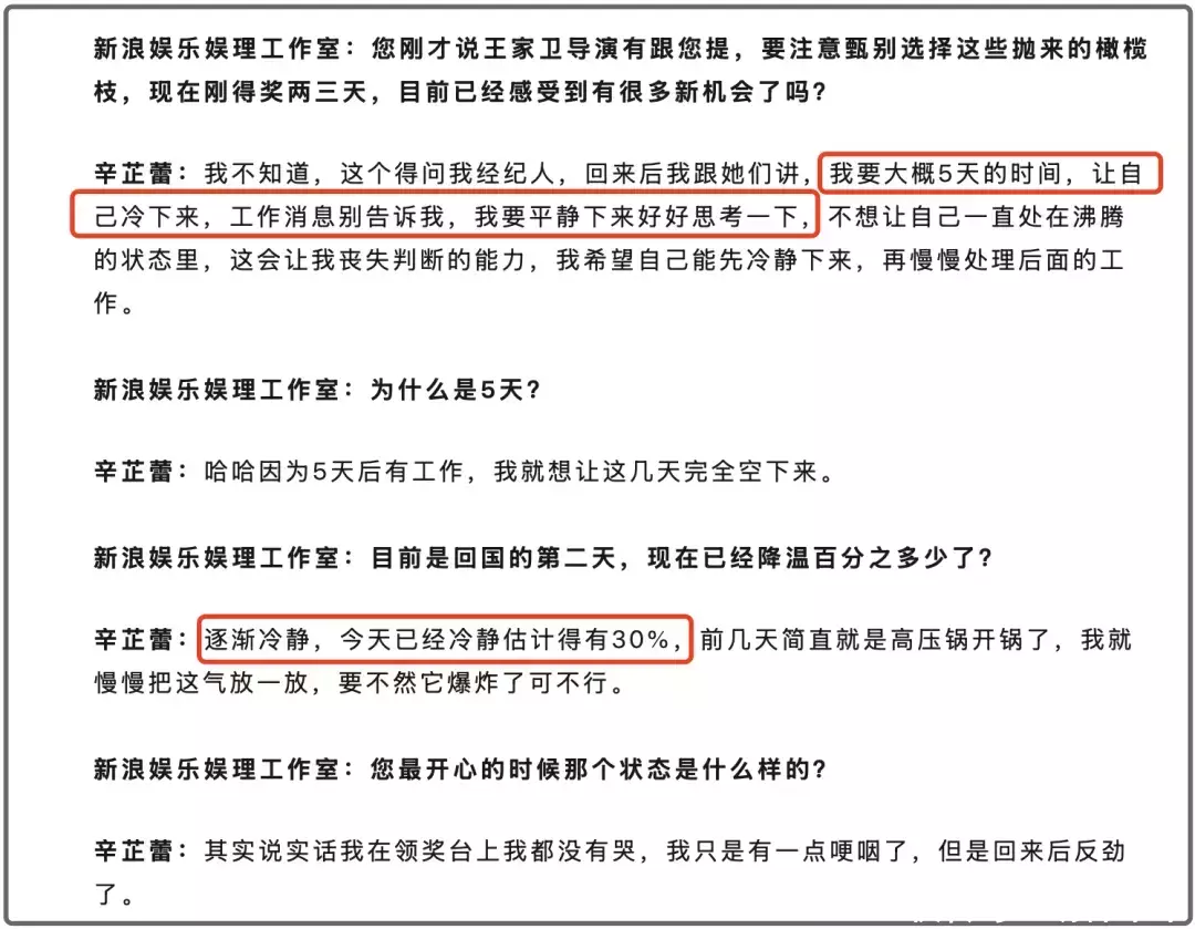 其实哪些人是衷心地祝福,辛芷蕾心里也能跟明镜似的,至于是否有很多新的机会找上门来,辛芷蕾表示自己目前还不知道,得问经纪人,因为自己要大概5天的时间,让自己冷静下来,有关工作的消息别告诉她,她要平静下来好好思考。或许这段时间的冷却对于辛芷蕾来说,更能看清楚以后要面对的人事物。